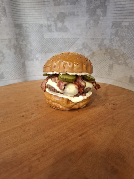 sezamová bulka, křenová majonéza s hořčicí, žlutá cibule, hovězí maso 200g, maasdamer, slanina, kyselé okurky