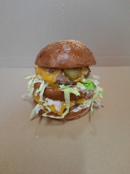 sezamová bulka, JoyMac omáčka, ledový salát, kyselá okurka, cibule, hovězí maso 2x200g, cheddar