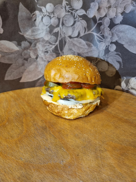 sezamová bulka, salát, rajče, hovězí maso 100g, cheddar, volské oko, majonéza