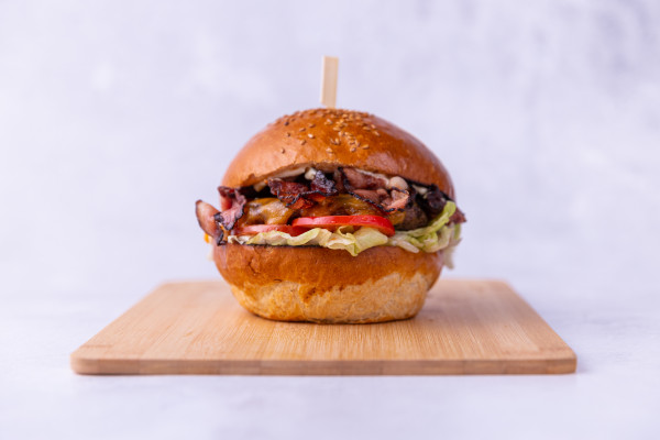 sezamová bulka, salát, rajče, hovězí maso 100g, karamelizovaná cibulka, cheddar, slanina, tatarská omáčka