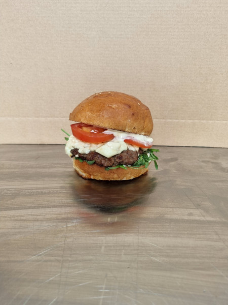 sezamová bulka, majonéza, rukola, hovězí maso 100g, balkánský sýr, čerstvá rajčata