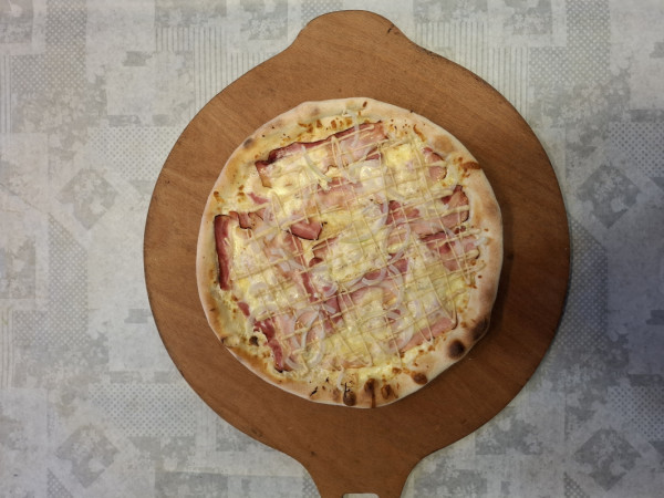 tomato-bbq základ, mozzarella, trhané vepřové maso, cheddar, smažená cibulka