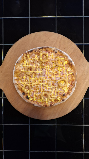 tomato-BBQ reaper základ, mozzarella, cheddar, slanina, chipotle papričky, červená cibule